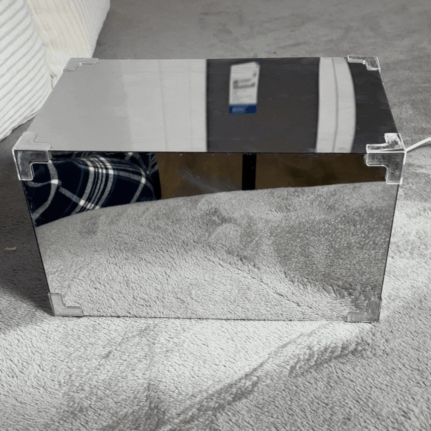 At first glance, it looks like a simple cube. When the lights go off and the inner light turns on, the interior is revealed, creating a striking infinite effect.