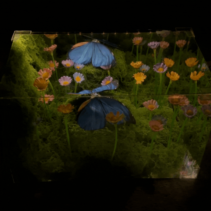 The butterfly moves its wings softly, adding a subtle sense of life and calm. It’s not decorative — it’s what makes the cube feel alive.